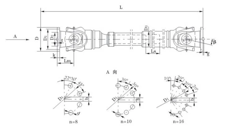 | Nie | Priemer otáčania D mm | Menovitý krútiaci moment Tn KN·m | Uhol ohybu osí β (°) | Krútiaci moment pri opotrebovaní Tf KN·m | Flex množstvo Ls mm | Veľkosť (mm) | Rotačná zotrvačnosť kg.m2 | Hmotnosť (kg) | |||||||||||